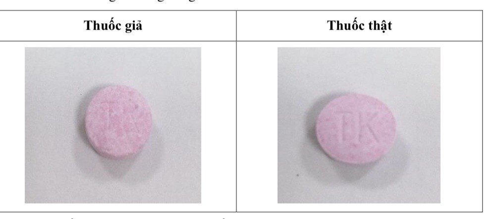 | Nét khắc chữ "TK" trên viên thuốc Ophazidon giả không sắc nét; màu sắc trên viên thuốc giả không đồng nhất. |