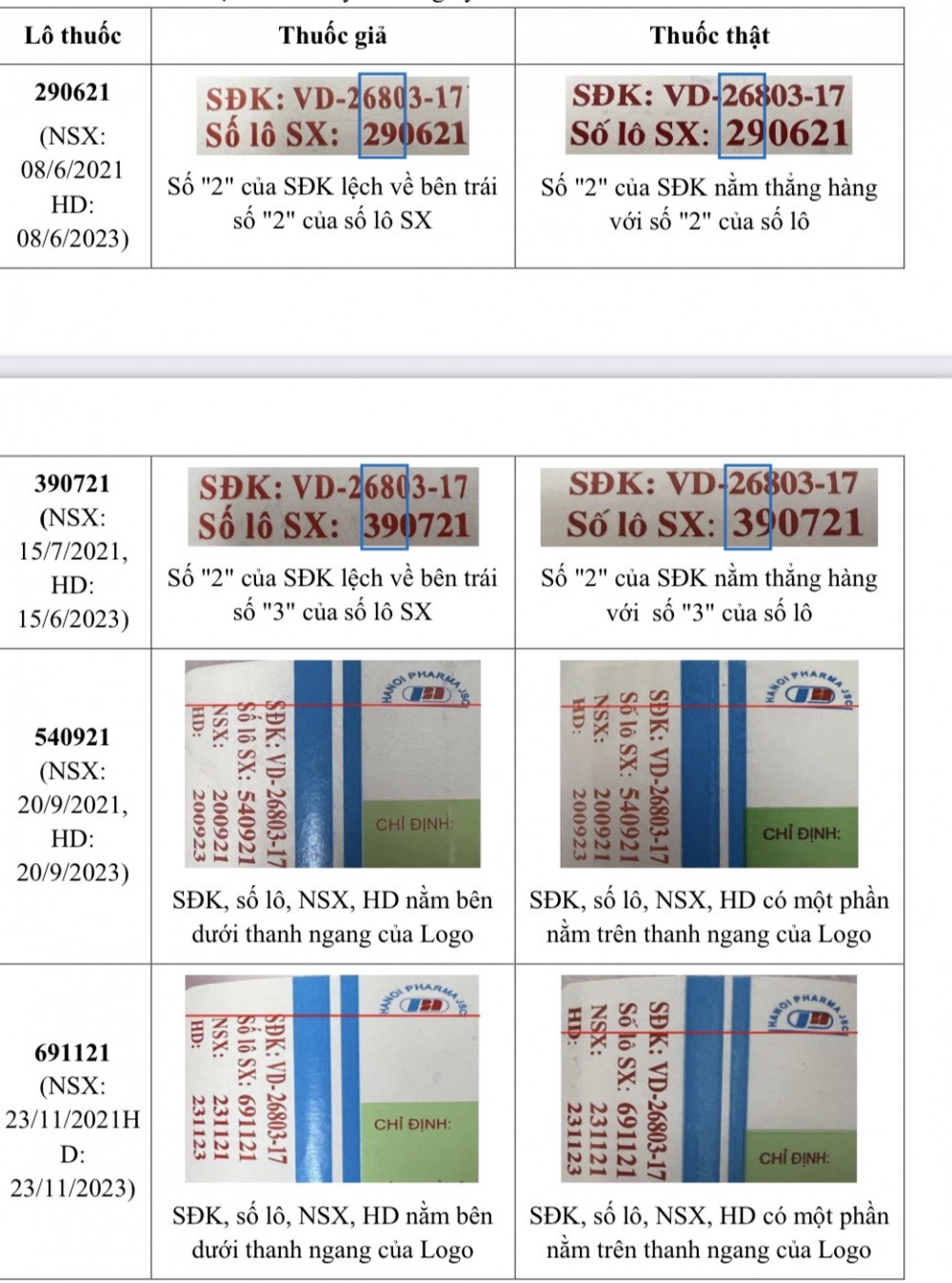 Kết quả kiểm nghiệm các mẫu không đạt tiêu chuẩn chất lượng về các chỉ tiêu Định tính, Định lượng (cafein) và Định lượng (paracetamol). Sau khi xem xét, đối chiếu các mẫu thuốc viên nén Ophazidon giả trên do Trung tâm kiểm nghiệm thuốc, mỹ phẩm, thực phẩm Hà Nội cung cấp với mẫu thuốc thật do Công ty Cổ phần Dược phẩm Hà Nội cung cấp, để đảm bảo an toàn cho người sử dụng, Cục Quản lý Dược đề nghị Sở Y tế các tỉnh, thành phố trực thuộc Trung ương, Y tế các ngành: Thông báo cho các cơ sở kinh doanh, sử dụng thuốc thông tin về 4 lô thuốc giả trên (có các đặc điểm, dấu hiệu phân biệt với thuốc thật như trong hình dưới):