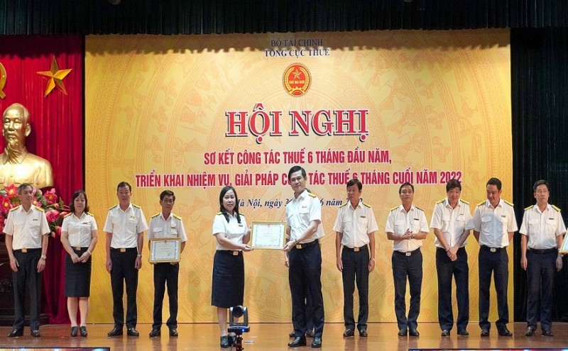 | Phó Tổng cục trưởng Tổng cục Thuế Vũ Chí Hùng trao giấy khen hoàn thành xuất sắc về triển khai hóa đơn điện tử cho bà Doãn Thị Oanh- Phó Cục trưởng phụ trách Cục Thuế Hưng Yên |