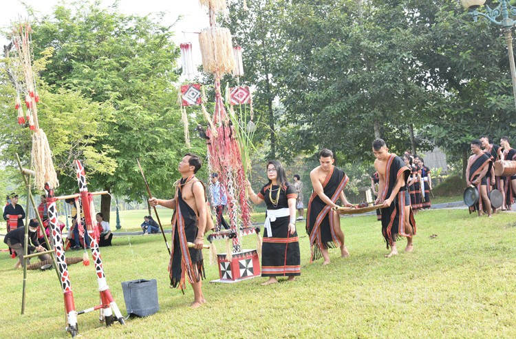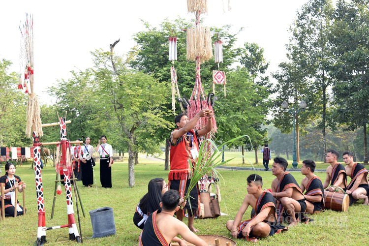 Lễ vật đã chuẩn bị xong, trong tiếng cồng chiêng rộn ràng, chủ lễ thực hiện các nghi thức cúng với lời khấn gửi đi thông điệp cầu nguyện cho dân làng: Có một mùa màng bội thu, ban phước lành cho người dân làm ăn thuận lợi, đoàn kết; cho dân làng nguồn nước trong lành quanh năm. Sau đó dặn dò con cháu và các thành viên trong làng phải biết giữ gìn nguồn nước trong lành, sạch sẽ; luôn đoàn kết, yêu thương, đùm bọc lẫn nhau, phấn đấu làm ăn để mùa màng bội thu.