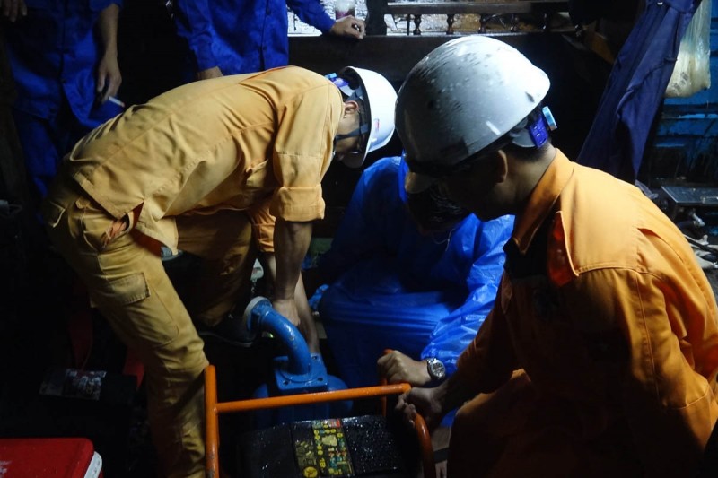 | Lực lượng cứu nạn bơm chống chìm để lai dắt tàu TH 90929 về bờ an toàn |