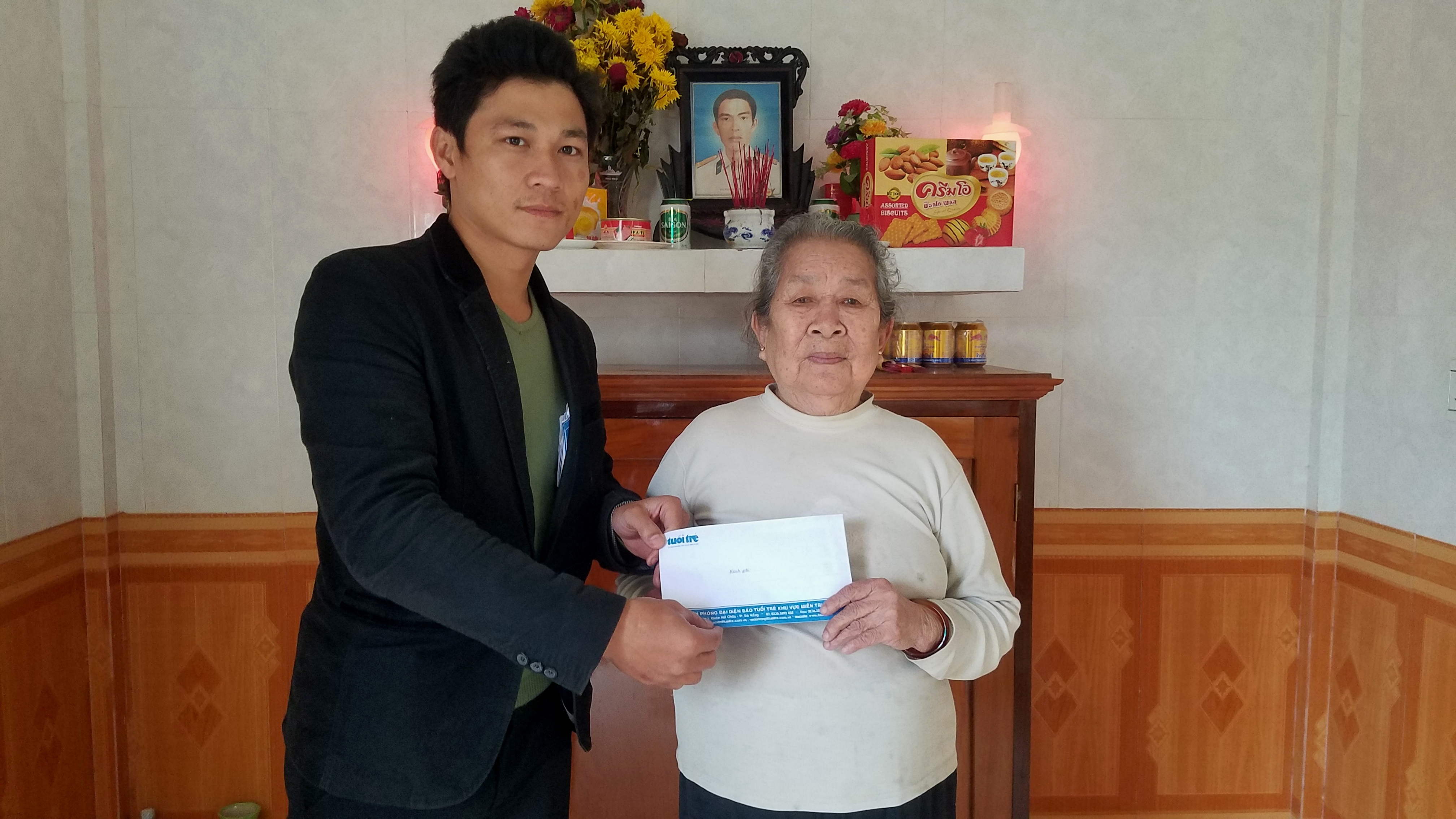 Đại diện báo Tuổi Trẻ tại Quảng Bình thay mặt bà Trần Thị Đào, cựu tù Côn Đảo trao tận tay những phần quà của bà đến các gia đình liệt sĩ Gạc Ma |