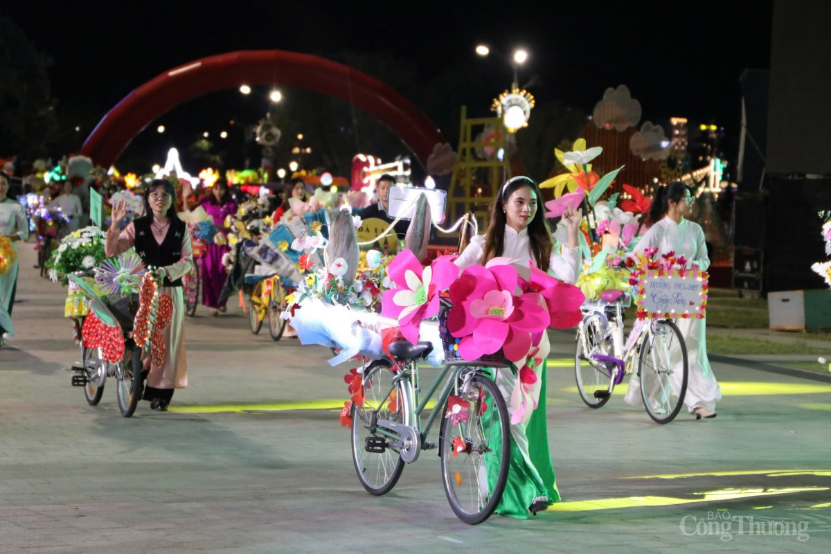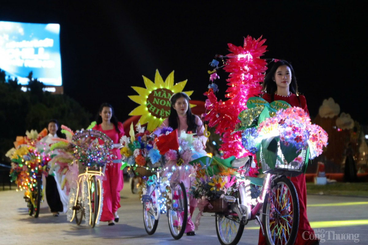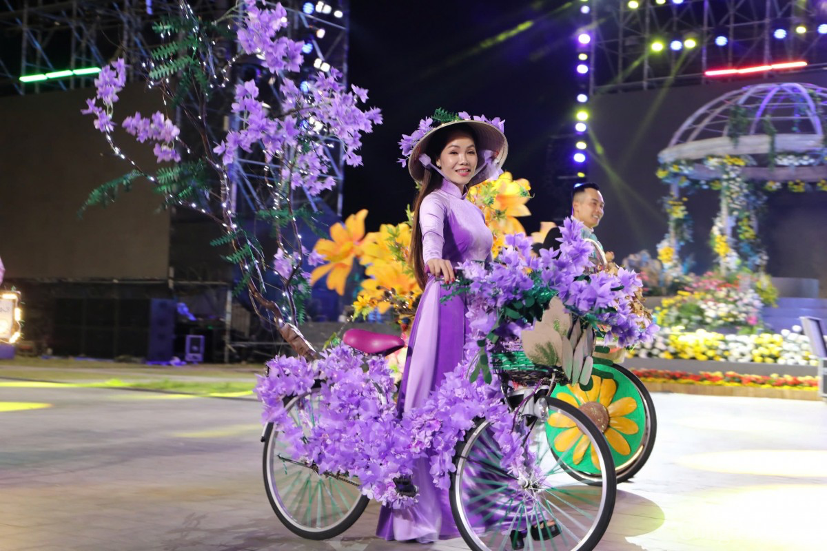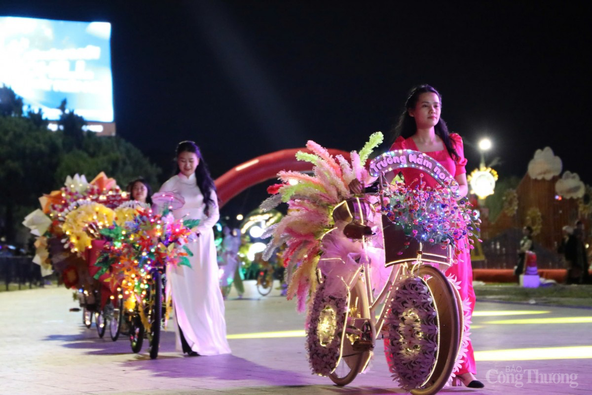 | Các thiếu nữ Đà Lạt bên xe đạp hoa diễu hành qua khán đài tại Quảng trường Lâm Viên TP. Đà Lạt vào đêm 6/12/2024. Ảnh: Lê Sơn |