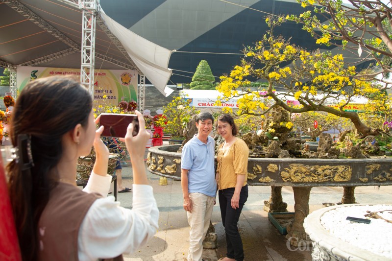 Khách hàng chụp ảnh trước những cây mai độc đáo, có giá trị cao