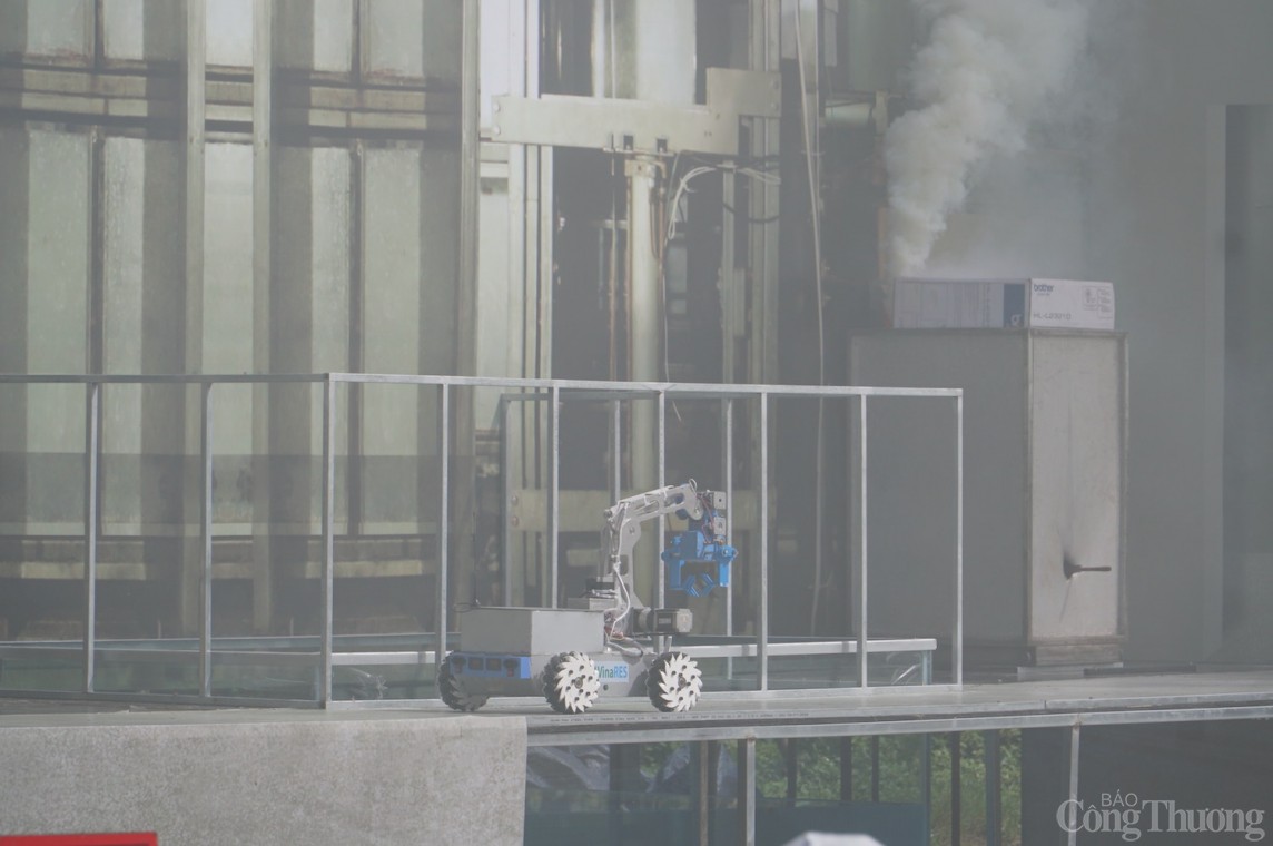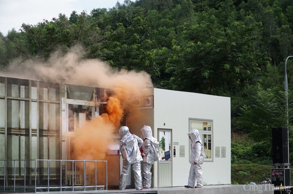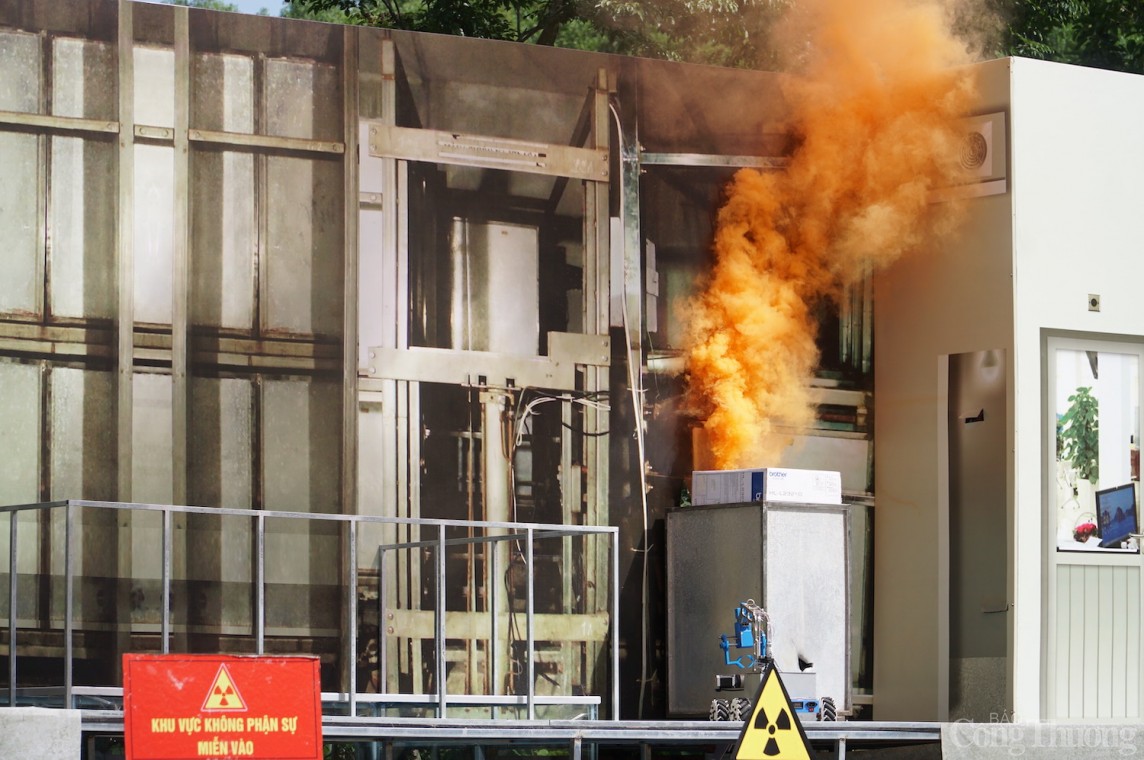 | Khi nhận được thông tin xác nhận liều trong khu vực buồng chiếu xạ ở ngưỡng an toàn, lực lượng phòng cháy, chữa cháy tiếp cận hiện trường, khống chế đám cháy đang bùng to tại khu vực chứa hàng. Do đặc điểm của khu vực buồng chiếu xạ, không thể sử dụng phương án phun nước để dập lửa, các chiến sĩ phải sử dụng bình chữa cháy cầm tay để khống chế đám cháy |