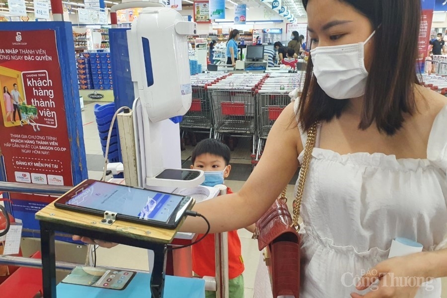 Tại siêu thị Coopmart, để hạn chế tiếp xúc trực tiếp, đơn vị bố trí máy quét QR Code tự động, máy rửa tay và đo thân nhiệt tự động, người dân chỉ cần đặt máy vào khu vực quét QR Code, máy sẽ quét tự động và trả kết quả, sau đó sẽ quay sang rửa tay sát khuẩn và đo thân nhiệt. Tất cả các bước thực hiện chỉ trong vòng chưa đầy 10 giây.