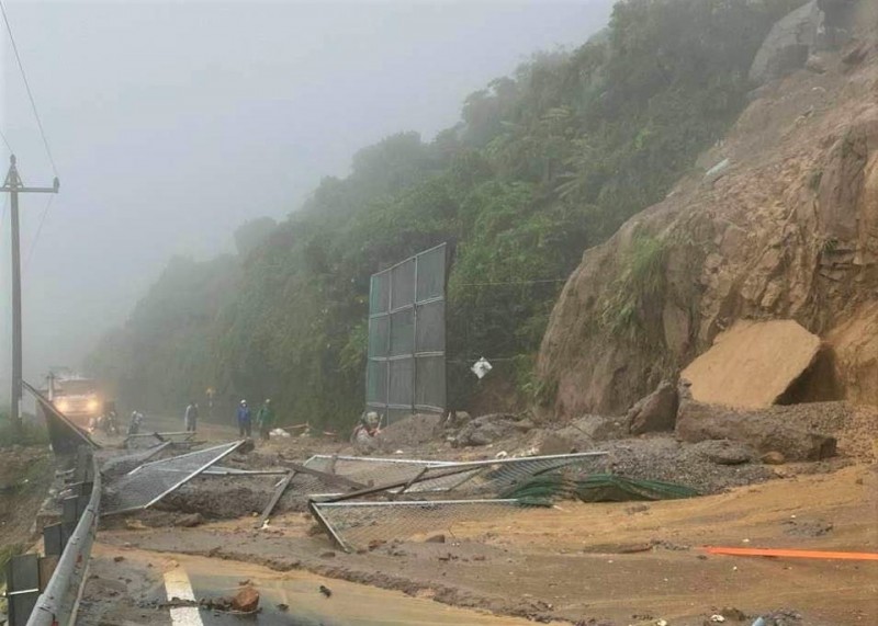 | Hiện lực lượng chức năng đã có mặt tại vị trí sạt lở để nắm tình hình. Lực lượng cảnh sát giao thông TP. Đà Nẵng và tỉnh Thừa Thiên Huế tổ chức chốt chặn không cho người, phương tiện lên đèo Hải Vân ở cả 2 phía Bắc và Nam của đèo. (Ảnh chụp lúc 16h00 ngày 13/10) |