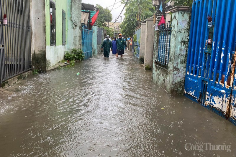 | Đường Trần Xuân Lê (quận Thanh Khê) nước đã tràn vào đến sân nhà người dân và đang dâng lên cao |