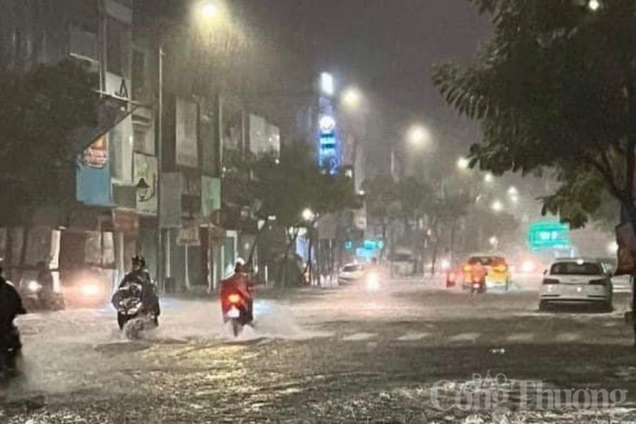 | Tối qua 1/4, mưa lớn kéo dài khiến nhiều tuyến đường tại Đà Nẵng ngập sâu. (Trong ảnh: Ngập lụt tại tuyến đường Hàm Nghi giao đường Nguyễn Văn Linh). |