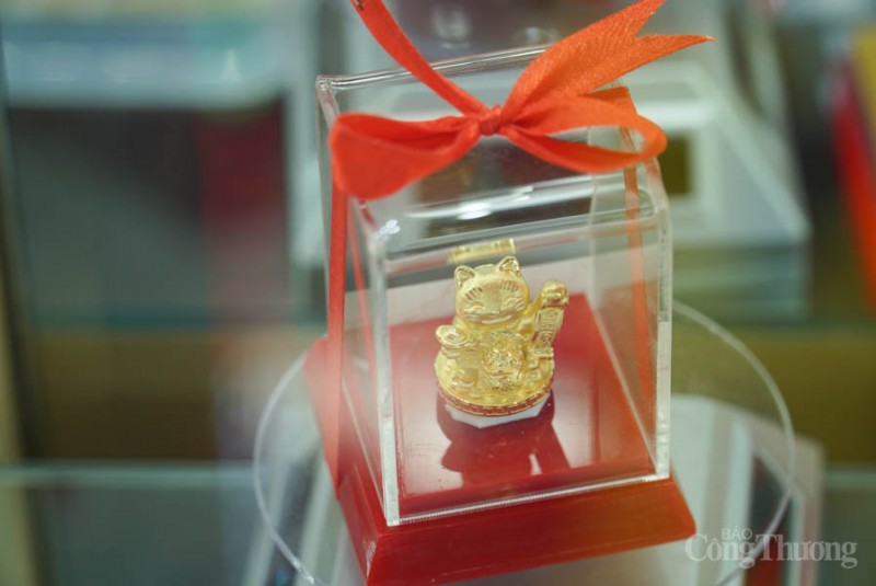 | Các sản phẩm vàng trong ngày Vía Thần Tài rất đa dạng. Trong đó, nhiều nhất là vàng khâu (vàng nhẫn) 0,5 chỉ, 1 chỉ, 2 chỉ; hàng ép vỉ in thần tài, hình mèo – linh vật của năm, tượng linh vật mèo, thần tài bằng vàng,... |