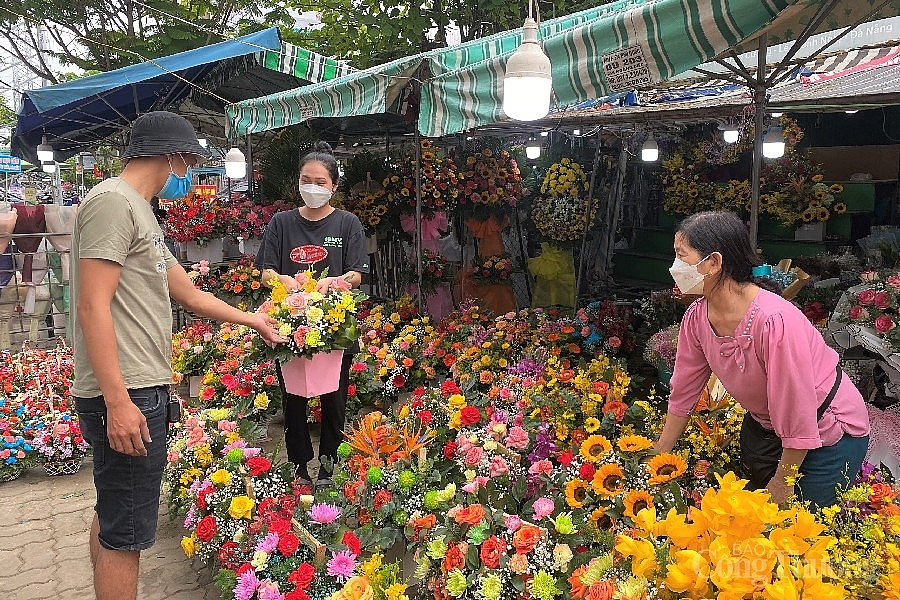 Bà Nguyễn Thị Chạy (bìa phải, chủ cơ sở hoa tươi Diệu Hiền tại chợ Hòa Cường) cho biết, giá nhập vào của hoa tươi năm nay tăng cao hơn so với mọi năm do cước vận chuyển tăng giá, đồng thời phía nguồn cung từ nhà vườn hạn chế.