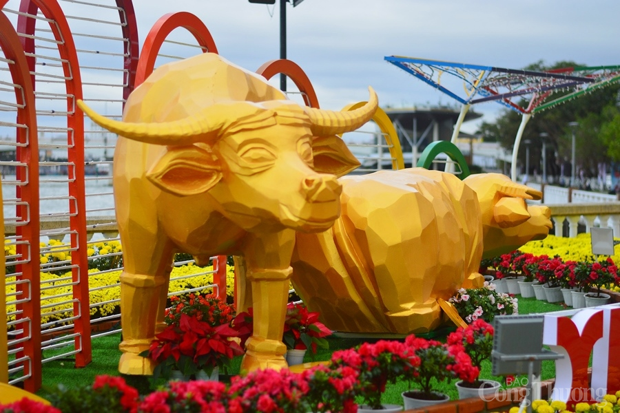 | Linh vật biểu tượng của năm Tân Sửu là trâu đất nên tạo hình trâu vàng trở thành điểm nhấn nổi bật của đường hoa Xuân |