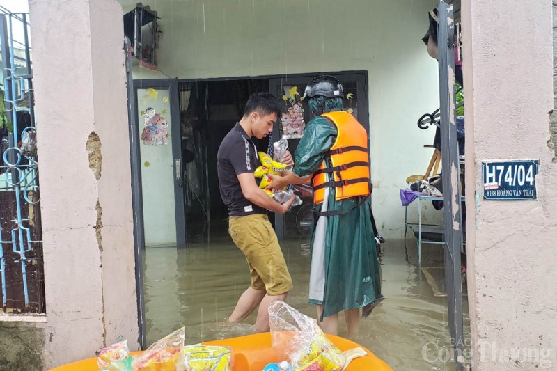 | Cũng trong sáng 14/10, phường đã vận động, tạm ứng để hỗ trợ 150 thùng mì tôm, 500 bánh mỳ và 500 chai nước tiếp tế lương thực cho người dân khu vực bị ngập sâu đang sơ tán tại chỗ (Ảnh: Cán bộ phường Hòa Khánh Nam mang bánh mì xuống hỗ trợ các hộ dân sơ tán tại chỗ tại đường Mẹ Suốt). |