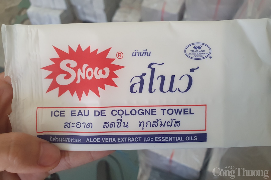 Qua kiểm đếm, gồm 20.043 sản phẩm khăn ướt thành phẩm; nguyên liệu (bao bì gắn dấu hiệu "SNOW và hình", khăn vải), quy đổi khoảng 6.000 cái khăn ướt thành phẩm.