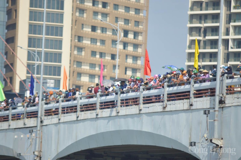 | Hai bờ sông Hàn và trên cầu Sông Hàn, hàng nghìn người dân, du khách đã tập trung từ sáng sớm và cổ vũ cho các đội đua. |