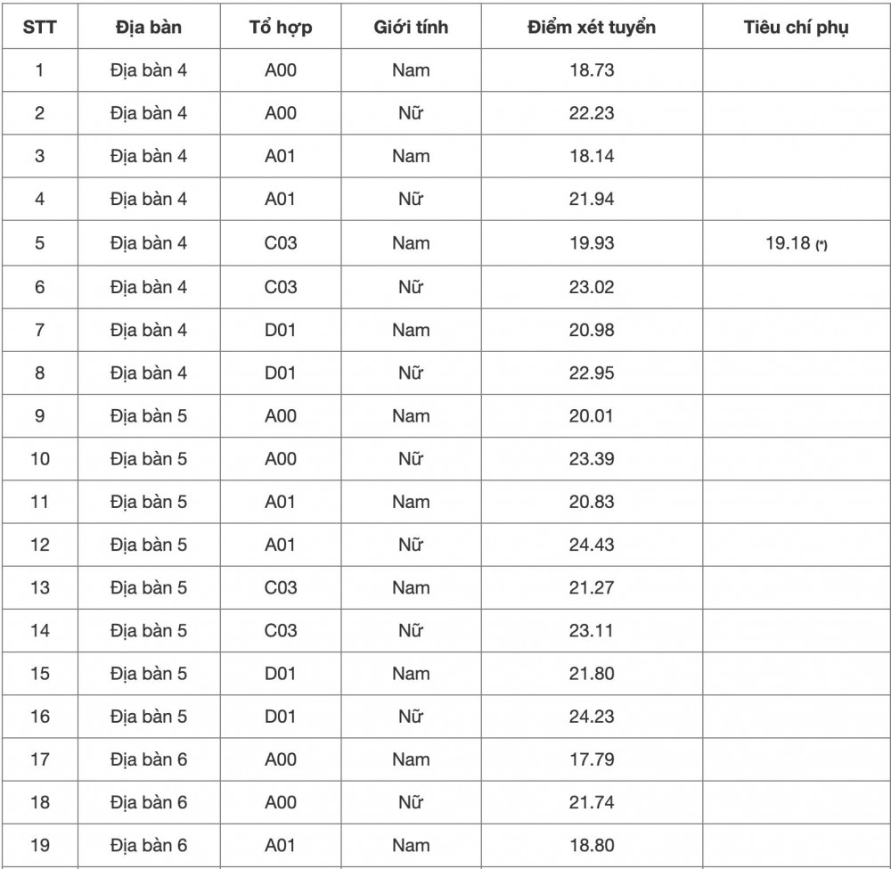 Mức điểm chuẩn dao động từ 15,42 đến 24,43 điểm tùy địa bàn và khối ngành và giới tính. Trong đó, địa bàn 5, khối A01, đối với thí sinh nữ lấy mức điểm cao nhất.