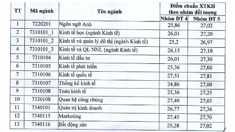 Tối ngày 21/7, Đại học Kinh tế Quốc dân công bố điểm chuẩn với phương thức xét tuyển kết hợp – dành cho nhóm đối tượng 4,5.