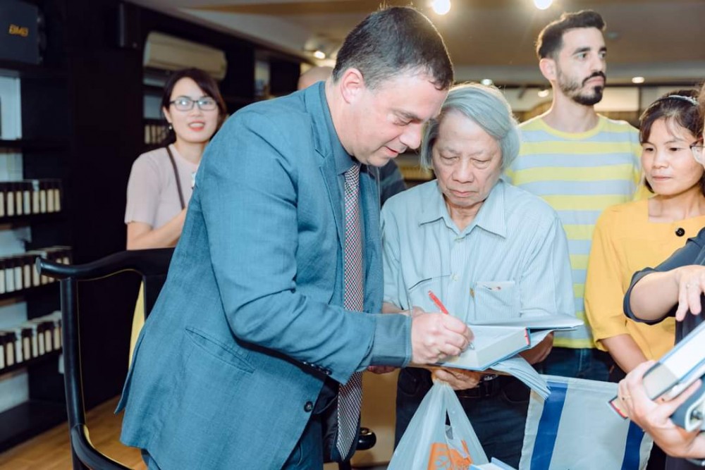 Kết thúc buổi ra mắt sách, Đại sứ Nadav Eshcar trong một cử chỉ rất thân thiện đã thay mặt tác giả Daniel Gordis ký tặng sách cho độc giả Việt Nam.