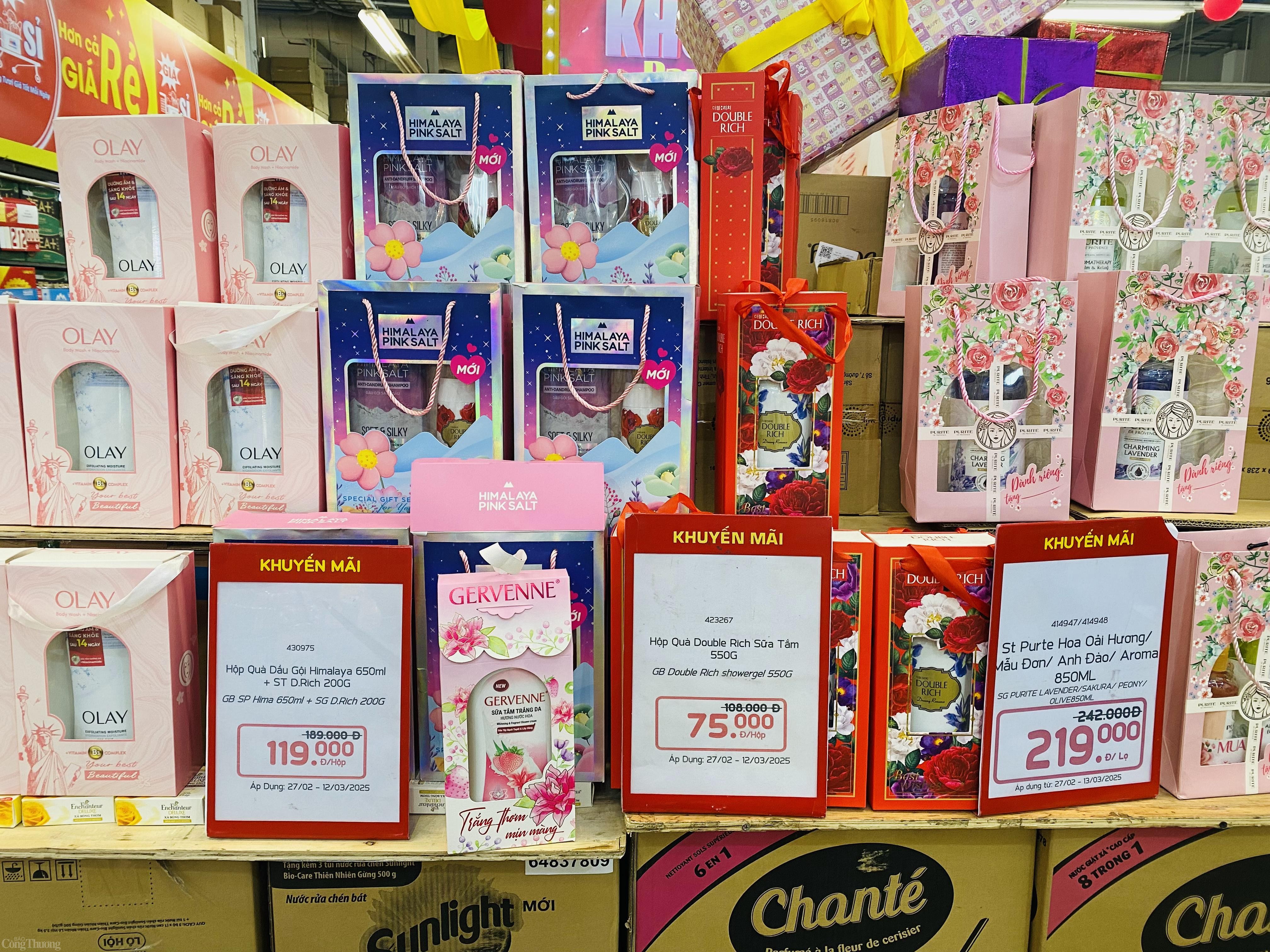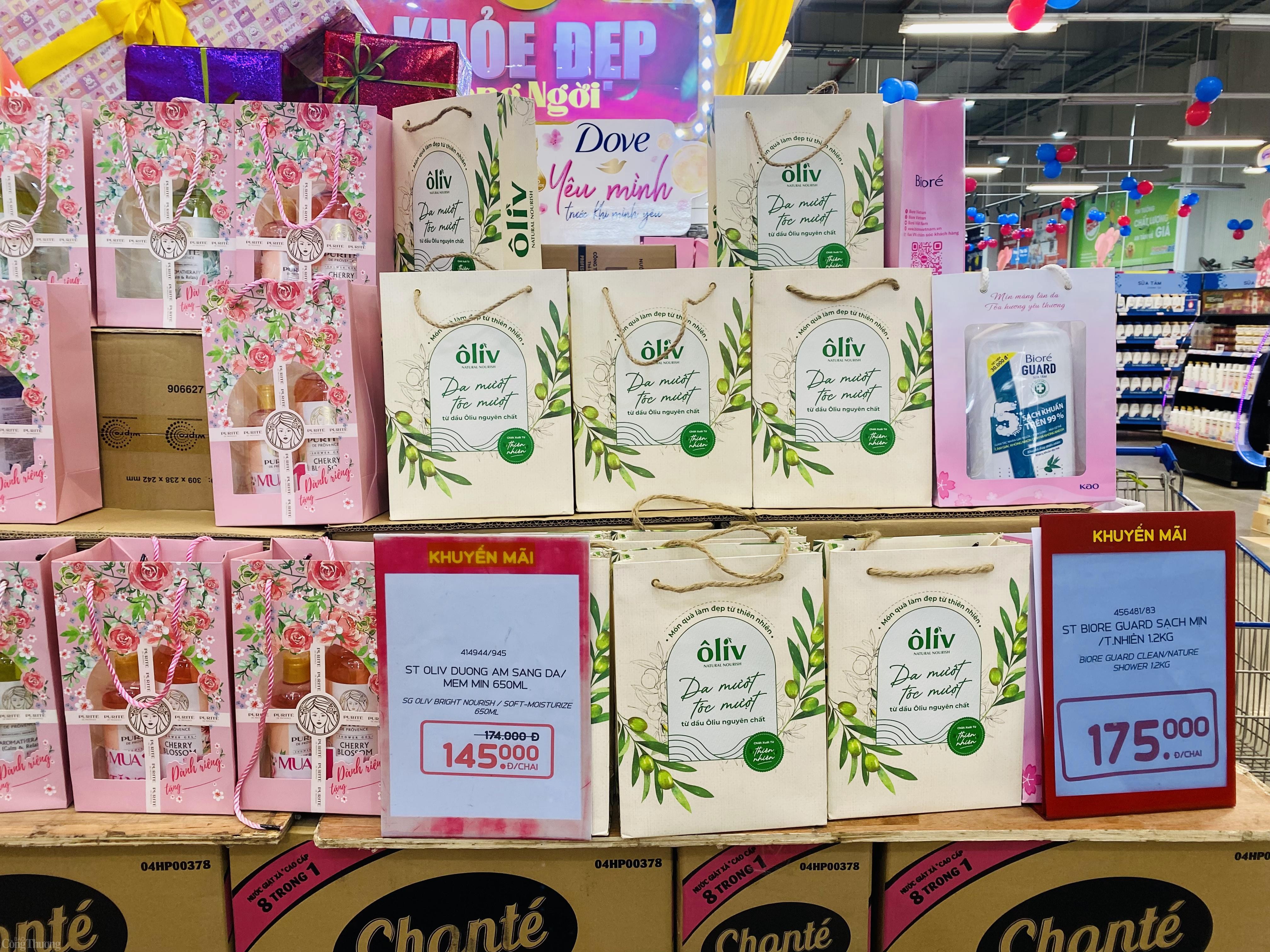 | Combo quà tặng đến từ những thương hiệu mỹ phẩm nổi tiếng được bày bán trong siêu thị trước thềm 8/3. Ảnh: Thanh Tuấn |