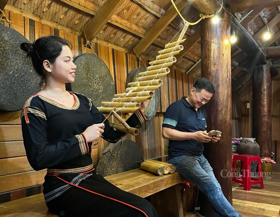 | Người phụ nữ đồng bào dân tộc Êđê gõ nhạc cụ truyền thống, phục vụ du khách tại buôn Ako Dhong |