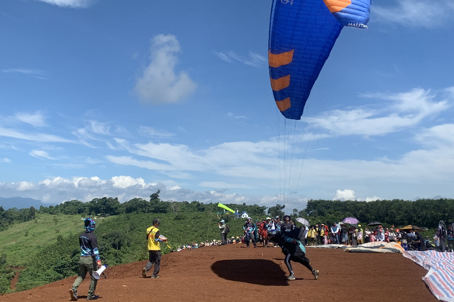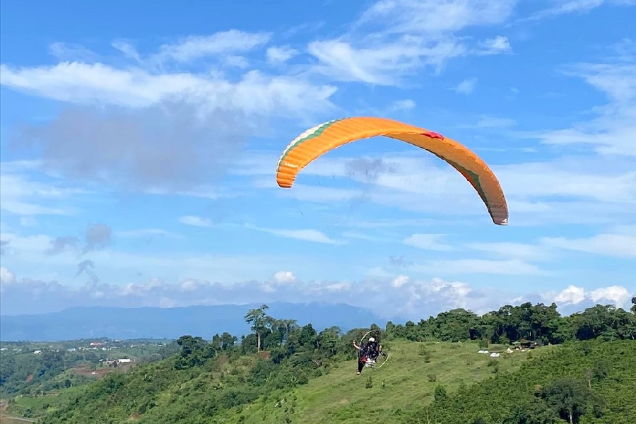 | Hình ảnh bay đẹp mắt từ vận động viên dù lượn. Được biết, trong khuôn khổ giải đấu, du khách còn được thưởng thức các sản vật của địa phương, cắm trại qua đêm, tìm hiểu đời sống văn hóa đặc sắc của đồng bào các dân tộc tại miền cao nguyên Đắk Nông. |