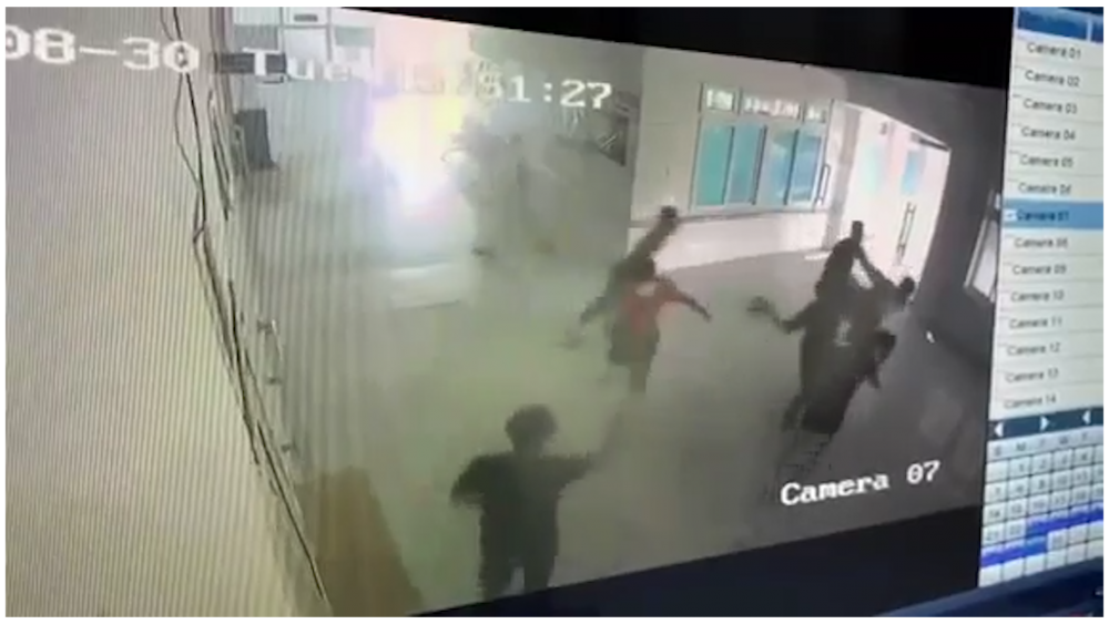 | Nhóm đối tượng côn đồ cầm theo hung khí gây náo loạn trung tâm y tế. Ảnh cắt từ clip |