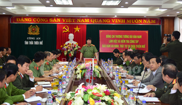 Thay mặt Bộ Công an và đoàn công tác, Thượng tướng Bùi Văn Nam - UVTW Đảng, Thứ trưởng Bộ Công an đã biểu dương và đánh giá cao những kết quả đạt được trong công tác đảm bảo an ninh quốc gia và trật tự an toàn xã hội của Công an tỉnh TT. Huế. Thượng tướng Bùi Văn Nam nhấn mạnh: Đảm bảo an ninh, an toàn hội nghị APEC năm 2017 và chuyến thăm của Nhà Vua và Hoàng hậu Nhật Bản tại tỉnh TT. Huế là một nhiệm vụ đặc biệt quan trọng và là vinh dự của lực lượng Công an nhân dân. Do đó, Công an tỉnh TT. Huế phải tham mưu cho Tỉnh ủy, UBND tỉnh có phương án, kế hoạch cụ thể, tập trung mọi lực lượng, phương tiện, phối hợp chặt chẽ các đơn vị Bộ Công an, lực lượng vũ trang, phát động phong trào toàn dân bảo vệ an ninh Tổ quốc, huy động cả hệ thống chính trị vào thực hiện nhiệm vụ đảm bảo an toàn tuyệt đối cho các hoạt động. Đây cũng là cơ hội để quảng bá hình ảnh tươi đẹp, thân thiện, hiếu khách về đất nước, con người Việt Nam nói chung và vùng đất TT. Huế nói riêng trong lòng bạn bè và du khách quốc tế.
