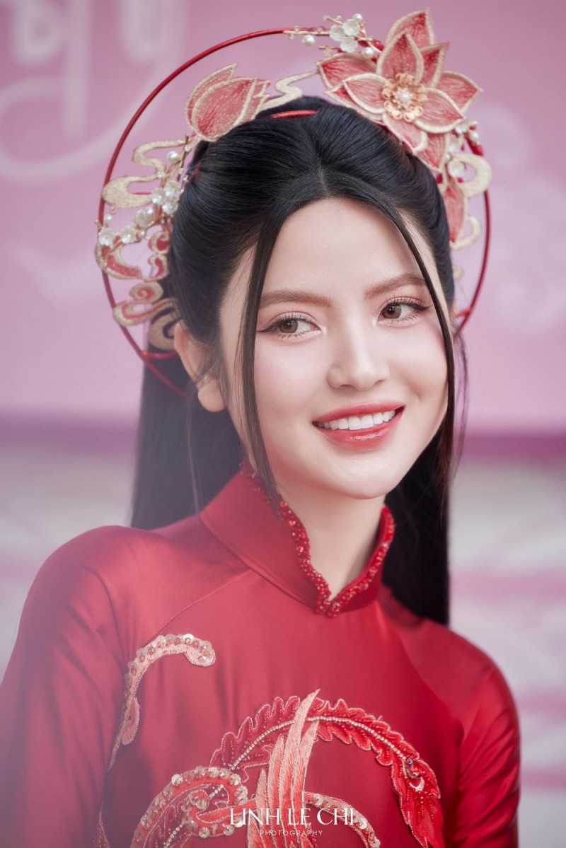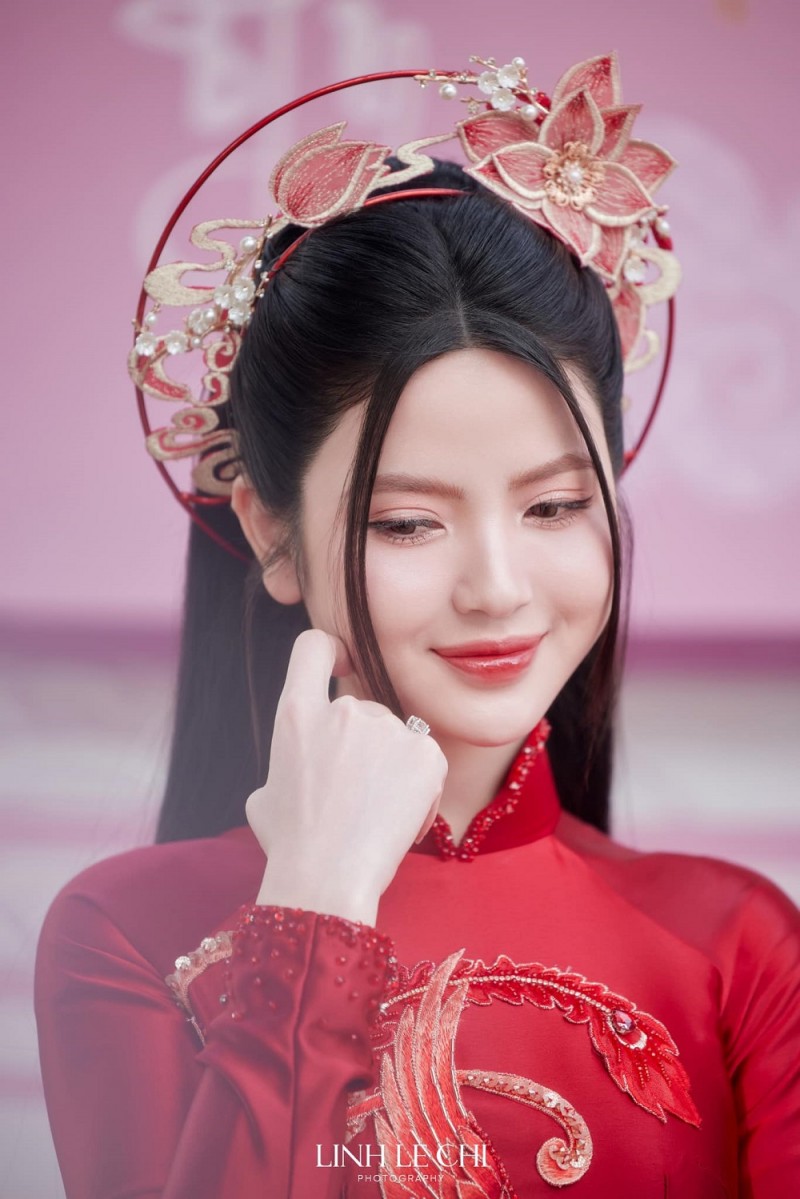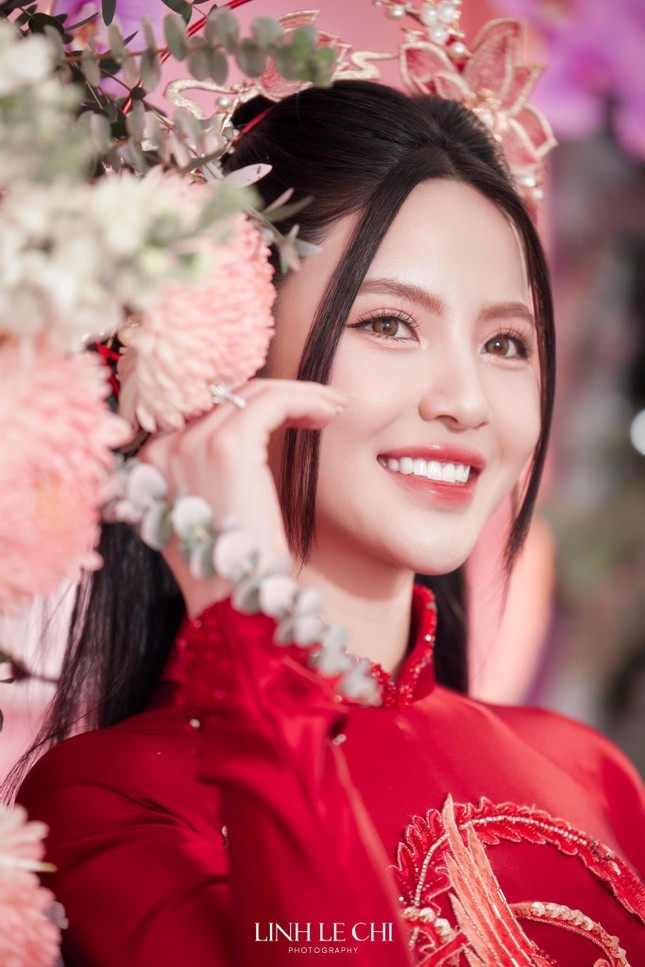 | Trong ngày vui của cặp đôi trai tài - gái sắc, Chu Thanh Huyền khoe nhan sắc rạng rỡ với bộ áo dài đỏ thướt tha cùng nụ cười toả nắng. |