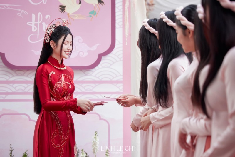 Trong lễ ăn hỏi, cô dâu Thanh Huyền khoe nhan sắc thăng hạng, xinh đẹp, dịu dàng trong tà áo dài truyền thống sắc đỏ rực rỡ mang tên Liên hoa triều phụng. Áo dài của cô dâu sử dụng vải lụa satin cao cấp với tone đỏ hồng sang trọng, nổi bật.