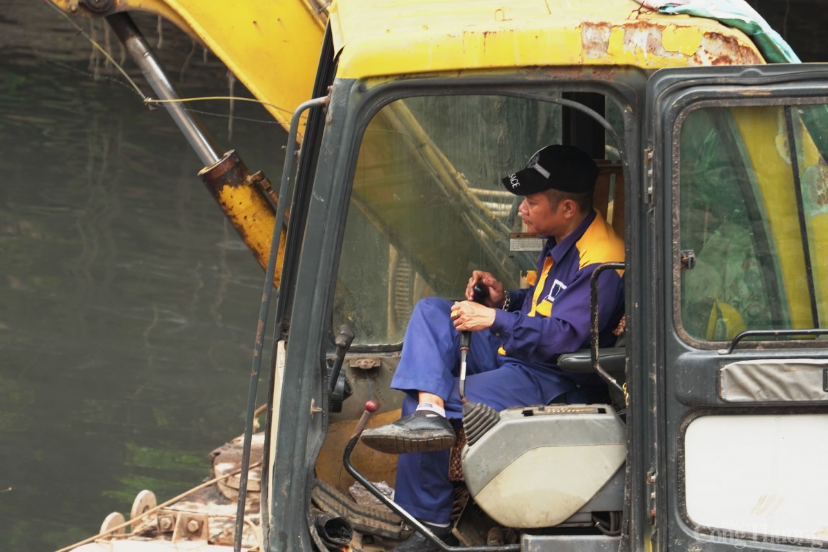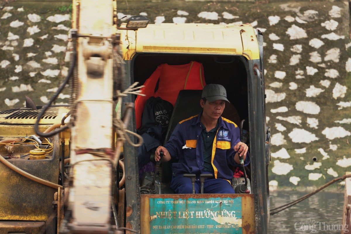 | Theo ông Phan Kỳ San, Tổ trưởng Tổ Cơ giới 10, để tiến hành nạo vét sông Tô Lịch, xí nghiệp sử dụng các xe cẩu 30 tấn hoạt động trên các phao nổi. |