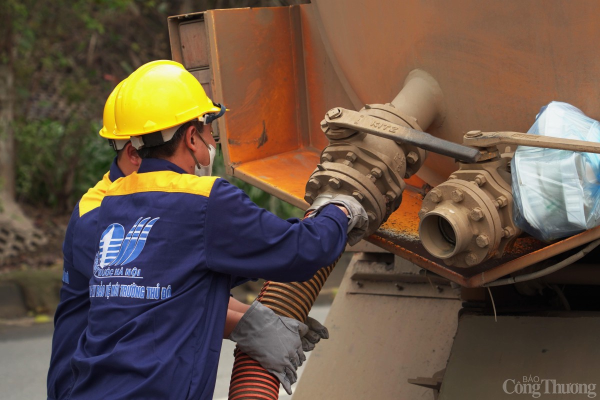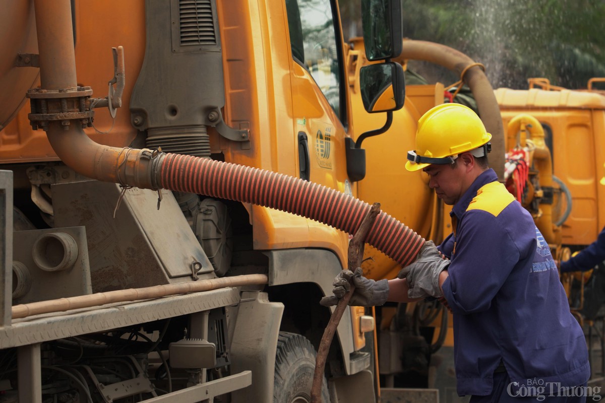 | Ngoài ra, các công nhân khác cũng được bố trí làm việc ở các thùng bùn để dẫn ống hút đưa bùn thải tới các xe vận chuyển trước khi đưa tới bãi đổ tập trung. |
