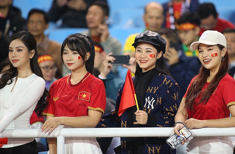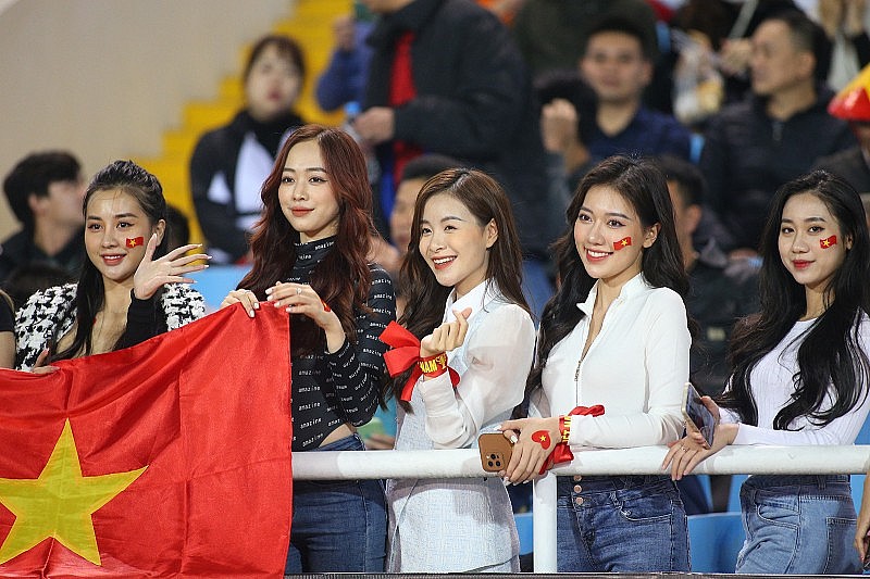 Các mỹ nhân trang điểm nhẹ nhàng, cầm theo quốc kỳ và dán đề-can trên má cổ vũ nồng nhiệt. Cô nào cô nấy khi được ống kính lia tới chụp hình đều chuẩn bị cho mình một tinh thần đón ống kính vô cùng chuyên nghiệp.