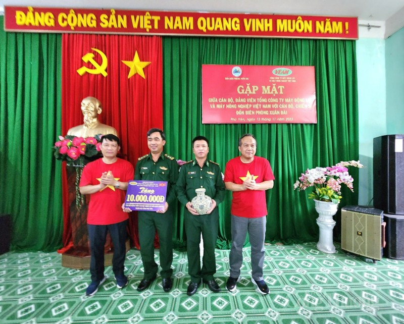 | Ông Mai Mạnh Dũng- Phó Bí thư Đảng ủy (đầu tiên bên trái) và ông Lê Minh Quy - Phó Tổng giám đốc VEAM (đầu tiên bên phải) đại diện Đảng bộ cơ quan VEAM tặng quà cho cán bộ, chiến sỹ Đồn biên phòng Xuân Đài- Bộ đội Biên phòng tỉnh Phú Yên |