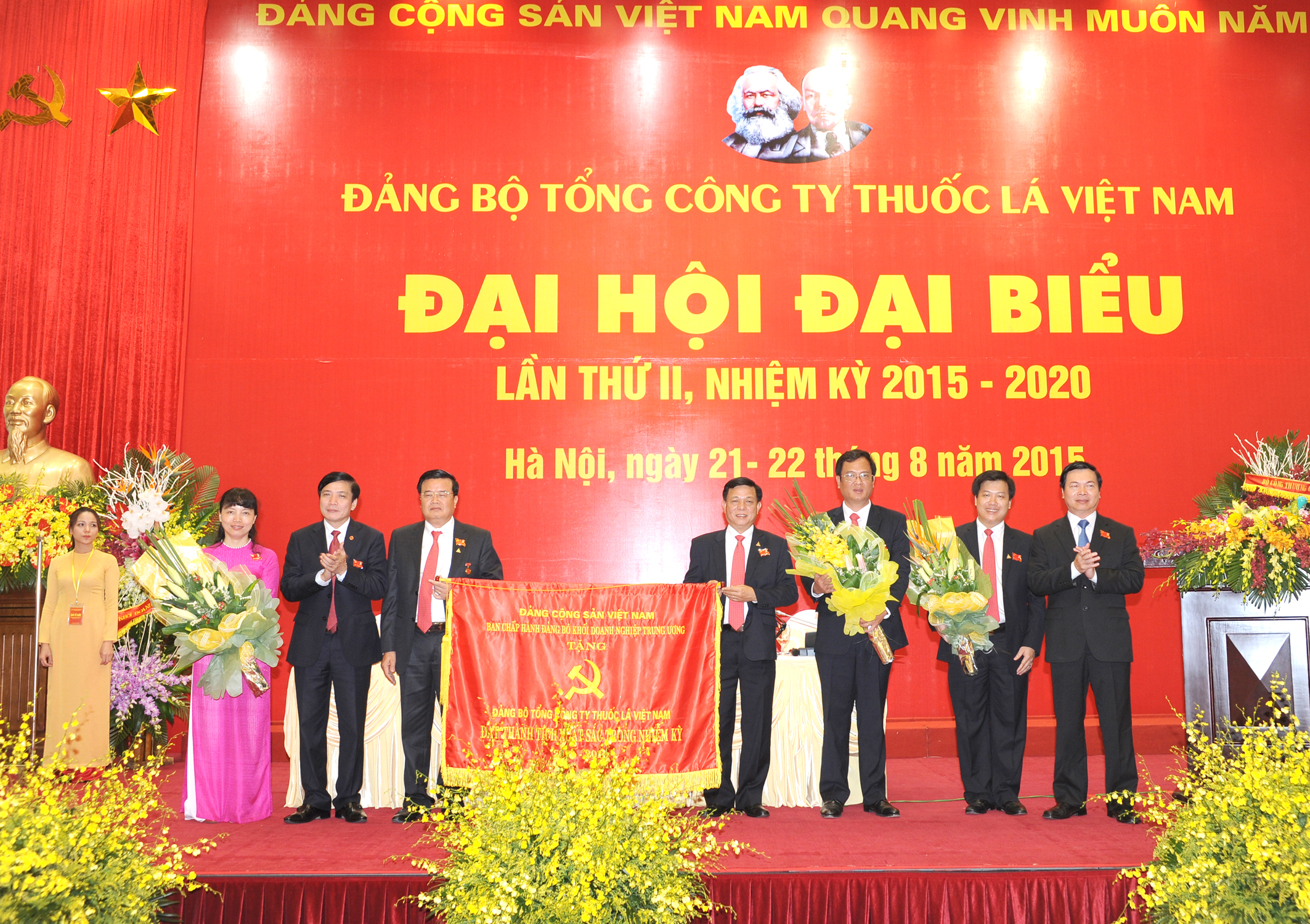 Đại diện Đảng ủy Khối các DN Trung ương tặng cờ thi đua cho Đảng ủy Tổng Công ty Thuốc lá Việt Nam do những thành tích xuất sắc trong nhiệm kỳ 2010 - 2015