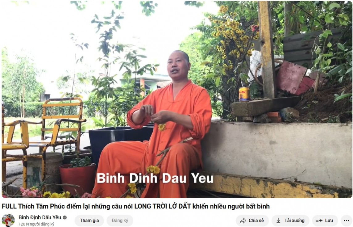 | Đăng những phát ngôn sốc của “thầy chùa” dởm Thích Tâm Phúc, kênh Youtube Bình Định Dấu Yêu câu view bất chấp? |