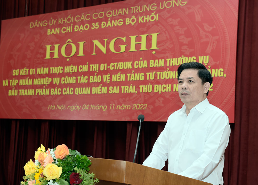 Phát biểu tại hội nghị, đồng chí Nguyễn Văn Thể cho biết: Sau một năm thực hiện Chỉ thị 01-CT/ĐUK nhận thức của cấp ủy các cấp và đội ngũ cán bộ, đảng viên về ý nghĩa, vai trò, tầm quan trọng của công tác bảo vệ nền tảng tư tưởng của Đảng, đấu tranh phản bác các quan điểm sai trái thù địch đã được nâng lên rõ rệt. Công tác bảo vệ nền tảng tư tưởng trong Đảng bộ Khối các cơ quan Trung ương và các đảng ủy trực thuộc đã được tăng cường và thu được những kết quả đáng khích lệ. Điều đó thể hiện rất rõ qua Báo cáo sơ kết 1 năm thực hiện Chỉ thị số 01-CT/ĐUK và đặc biệt việc tuyên truyền, phát động và trao giải Cuộc thi viết chính luận về bảo vệ nền tảng tư tưởng của Đảng, đấu tranh phản bác các quan điểm sai trái thù địch do Đảng bộ Khối phát động đã đem lại hiệu quả tích cực.
