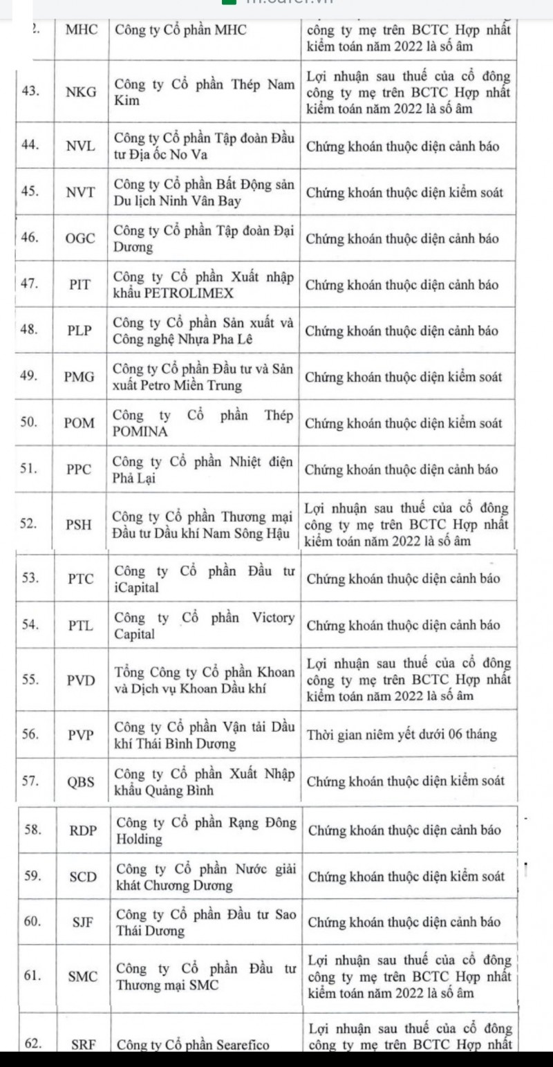 Trong danh sách này, chủ yếu là những cổ phiếu quen thuộc nằm trong diện bị cảnh báo hoặc kiểm soát như ABS, APC, AST, BCE, CIG, DXV, EVG, FDC, GMC, HVN, ITA, LDG, OGC, POM, PPC, PVP, SCD, SJF, TDH, TGG, TTF, VCA, VNL,...