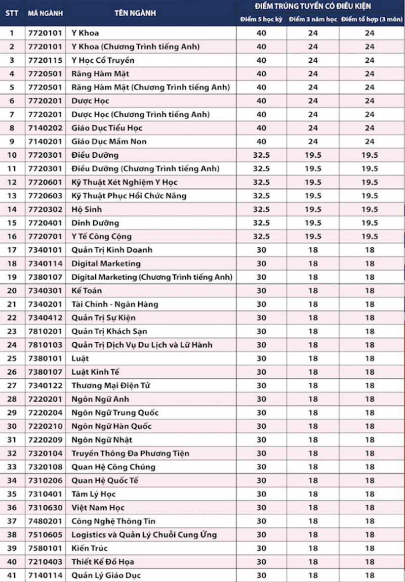 Trường Đại học Công nghệ TP. Hồ Chí Minh, điểm chuẩn học bạ cho 59 ngành đào tạo cho phương thức xét tổng điểm trung bình 3 học kỳ: Học kỳ 1 lớp 12 và học kỳ 1, học kỳ 2 lớp 11 và xét tổng điểm trung bình 3 môn năm lớp 12 từ 18 - 24 điểm. Mức điểm chuẩn này đã bao gồm điểm ưu tiên.