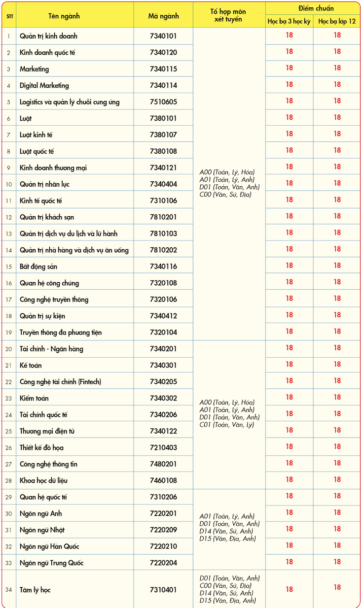 Trường Đại học Kinh tế - Tài chính TP. Hồ Chí Minh, điểm chuẩn học bạ cho 34 ngành đào tạo, đối với cả hai phương thức xét học bạ theo tổng điểm trung bình 3 học kỳ (học kỳ 1, học kỳ 2 lớp 11 và học kỳ 1 lớp 12); xét tuyển học bạ theo tổng điểm trung bình 3 môn năm lớp 12 có mức điểm chuẩn là 18 ở tất cả các ngành.