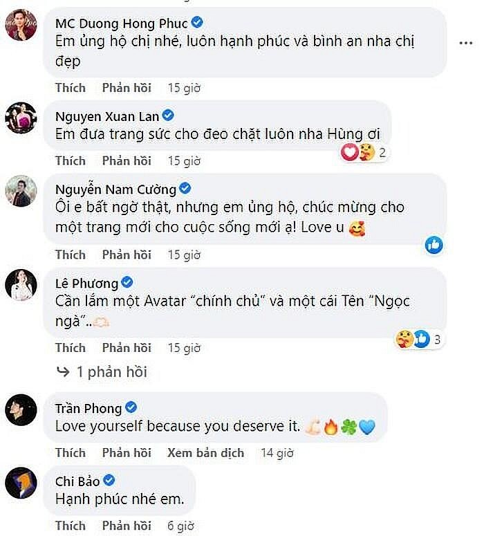 Ở dưới phần bình luận, nhiều nghệ sĩ đình đám đã để lại những lời chúc tới đạo diễn Ngọc Hùng: "Hạnh phúc khi là chính mình anh ơi", "Em ủng hộ chị nhé, luôn hạnh phúc và bình an nha chị đẹp", "Em đưa trang sức cho đeo chặt luôn nha Hùng ơi", "Ôi em bất ngờ thật, nhưng em ủng hộ, chúc mừng cho một trang mới cho cuộc sống mới ạ! Love u", "Cần lắm một Avatar “chính chủ” và một cái tên “Ngọc ngà"....