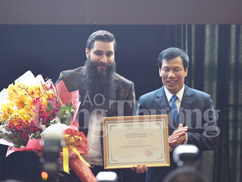 | Đạo diễn Jordan Vogt-Roberts nhận quyết định đại sứ du lịch Việt Nam từ Bộ trưởng Bộ VHTT&DL Nguyễn Ngọc Thiện |