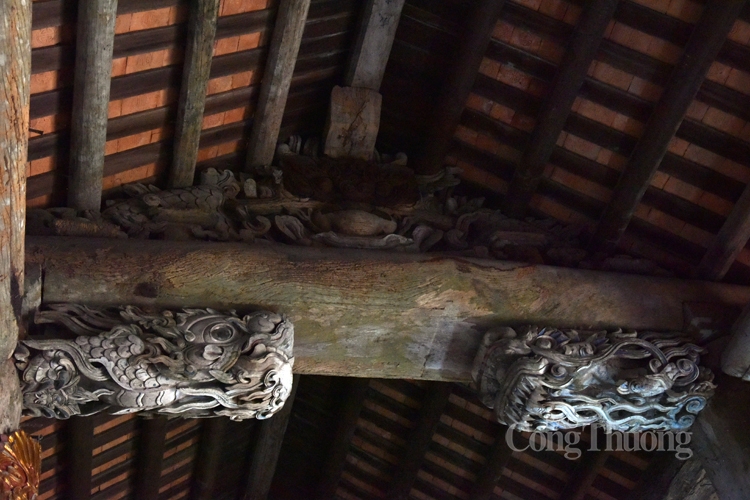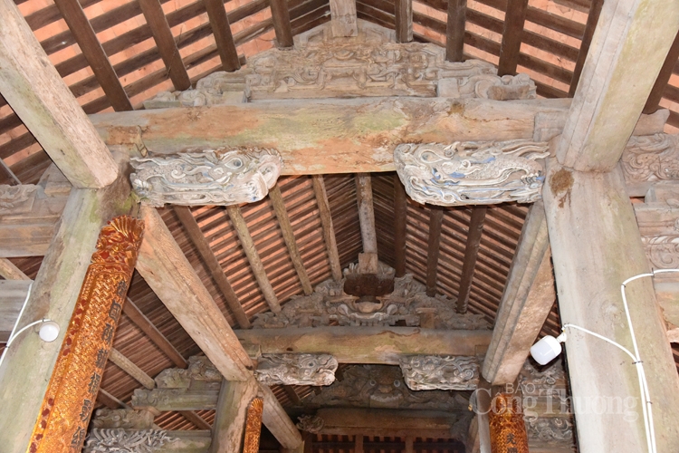 | Bên trong đình, các hoạ tiết vì kèo được chạm khắc công phu, tỉ mỷ |