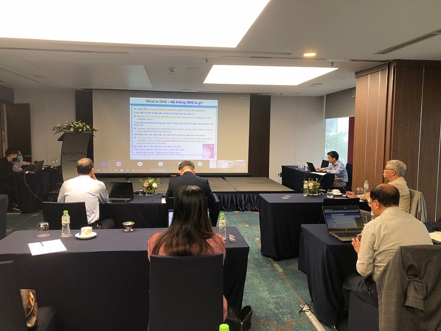 Trong chương trình tập huấn, các chuyên gia đến từ Nhật Bản và đại diện của Cục Hóa chất, Hội Hóa học Việt Nam, Hội đồng Trách nhiệm xã hội tự nguyện các doanh nghiệp Hóa chất Việt Nam cũng đã giới thiệu sâu và chia sẻ kinh nghiệm về GHS (phân loại và ghi nhãn hóa chất theo hệ thống hài hòa toàn cầu) hiện nay và các cách quản lý rủi ro đổi với dung môi. Tại lớp đào tạo, các học viên đến từ các doanh nghiệp, cơ quan quản lý đã rất chủ ý và đặt nhiều câu hỏi , thảo luận sôi nổi học tập, trao đổi và chia sẻ kinh nghiệm.