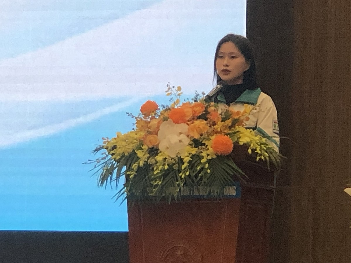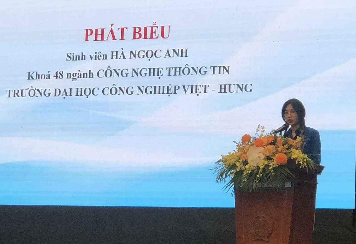 | Em Hà Ngọc Anh- Sinh viên khoá 48 Ngành Công nghệ Thông tin Trường Đại học Công nghiệp Việt- Hung phát biểu trong Toạ đàm |