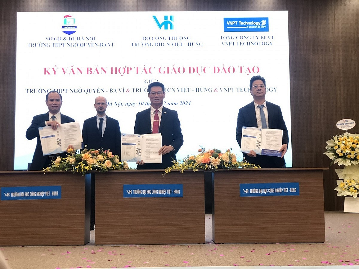 | Ký văn bản hợp tác giáo dục đào tạo giữa ba bên: Trường Trung học phổ thông Ngô Quyền- Ba Vì, Trường Đại học Công nghiệp Việt- Hung và Công ty Công nghệ Công nghiệp Bưu Chính viễn thông VNPT ( VNPT Technology) |