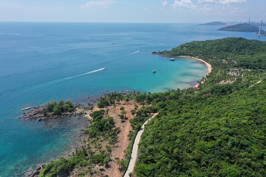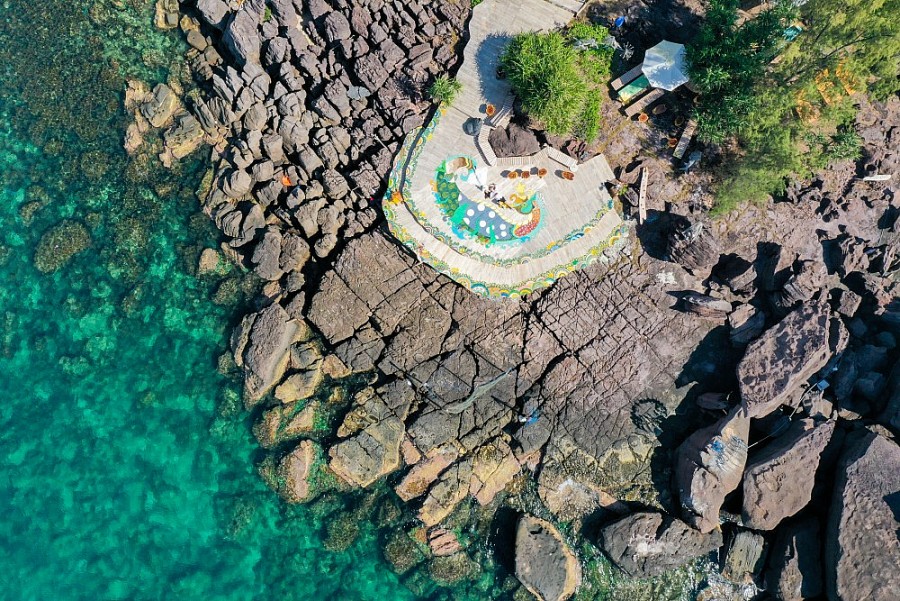 Những ghềnh đá, biển khơi ngút tầm mắt, chân trời xanh xa xa, hàng dừa nghiêng nghiêng trong gió, tất cả vẽ bức tranh Hòn Thơm vốn đã đẹp lại càng thiên đường hơn khi được ngắm nhìn từ độ cao lý tưởng của Mắt đại bàng.