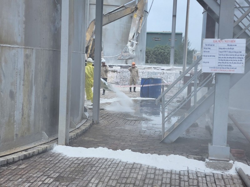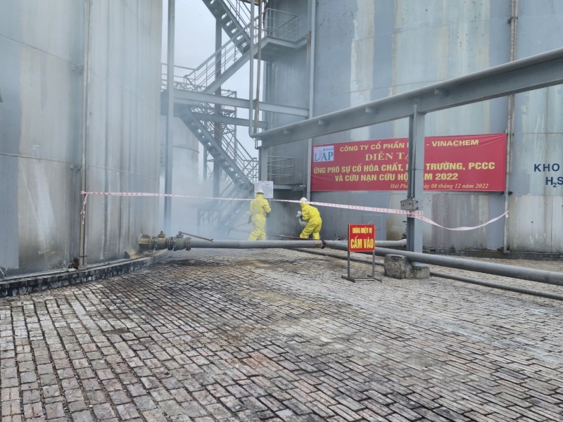Để giải quyết sự cố, công nhân tham gia tình huống giả định đã xử lý chống phát tán axit ra môi trường bên ngoài. Giải pháp được đưa ra là bơm rút toàn bộ axit trong tuyến ống; Sử dụng vôi bột quây xung quanh không để axit tràn rộng trên bề mặt; Điều động lực lượng ứng phó sự cố hóa chất, môi trường PCCC và cứu hộ, cứu nạn và lực lượng y tế, bảo vệ đến hiện trường.