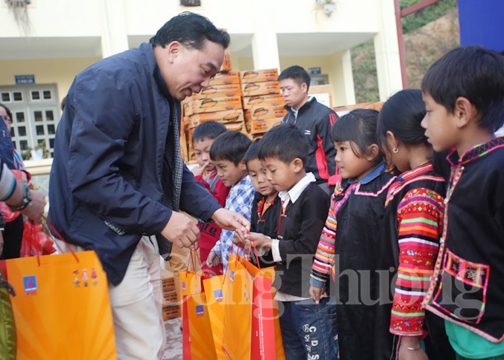 | Ông Nguyễn Anh Tuấn - Chủ tịch HĐQT PVI - trao quà cho các cháu học sinh Trường phổ thông dân tộc bán trú, Trường tiểu học và mầm non Sín Thầu, huyện Mường Nhé (tháng 1/2016) |