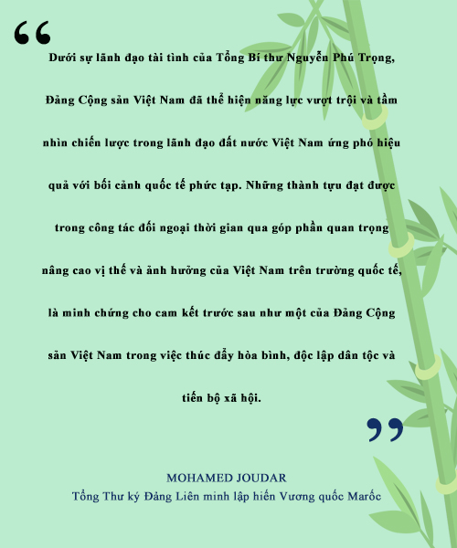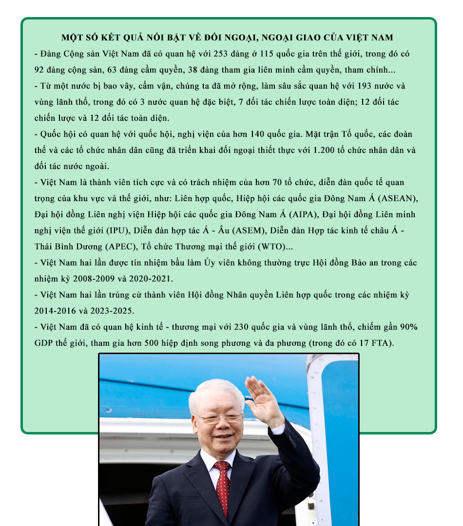 Thành tựu của công tác đối ngoại Việt Nam những năm qua là thành quả của toàn Đảng, toàn dân và toàn quân ta, trong đó nhân tố quan trọng nhất, có ý nghĩa quyết định là sự lãnh đạo trực tiếp, toàn diện của Đảng, đứng đầu là Tổng Bí thư Nguyễn Phú Trọng.