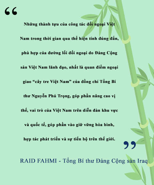 Dưới sự lãnh đạo của Đảng Cộng sản Việt Nam và Chủ tịch Hồ Chí Minh, trên cơ sở vận dụng sáng tạo những nguyên lý cơ bản của chủ nghĩa Mác - Lênin, kế thừa và phát huy truyền thống, bản sắc đối ngoại, ngoại giao và văn hoá dân tộc, tiếp thu có chọn lọc tinh hoa văn hóa thế giới và tư tưởng tiến bộ của thời đại, tại Hội nghị Đối ngoại toàn quốc ngày 14/12/2021, Tổng Bí thư Nguyễn Phú Trọng đã khẳng định: “Trường phái đối ngoại và ngoại giao rất đặc sắc và độc đáo của thời đại Hồ Chí Minh, mang đậm bản sắc ‘cây tre Việt Nam’, ‘gốc vững, thân chắc, cành uyển chuyển’,... thấm đượm tâm hồn, cốt cách và khí phách của dân tộc Việt Nam".
